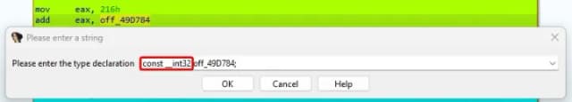 图 6:使用 IDA Pro 中的“Set type”命令(快捷键 Y)将偏移标记为常量。
