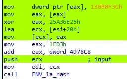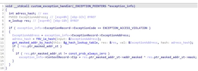 异常处理程序使用以下命令重新散列原始地址 FNV-1a 并使用这两个值来查询第二个预先计算的查找表。此查询返回实际目标函数的 XOR 掩码地址,同样与掩码一起返回。 The two values are XORed together and the resulting address is loaded into the EIP 注册,有效调用所请求的 WinAPI 函数。