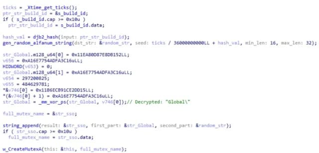 为了防止多个实例同时运行,AuraStealer 利用基于特定于构建和时间相关的值动态生成的互斥体。恶意软件首先加载 build_id 来自其配置的值(例如, a0858933-16a7-433f-a9cc-68490ace0576)并计算 djb2 散列它。然后将哈希值添加到整数除法的结果中 _Xtime_get_ticks()/36000000000,它有效地产生一个每小时变化一次的值。最终的和用作 Mersenne-Twister 伪随机数生成器的种子,该生成器用于生成长度在 16 到 32 个字符之间的随机字母数字字符串。生成的字符串前面带有 Global\,形成最终的互斥体名称。