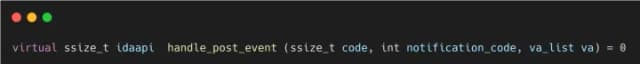 我们没有对具有破坏性且容易被恶意软件检测到的二进制文件进行修补,而是利用 IDA SDK 直接挂钩指令分析过程。这个想法很简单——我们不是让 IDA 自己分析指令,而是干预分析过程并修改指令的解码方式。为此,IDA 提供 post_event_visitor_t,一个类,允许通过重写虚函数来监听 IDA 中的特定事件并做出反应 handle_post_event.