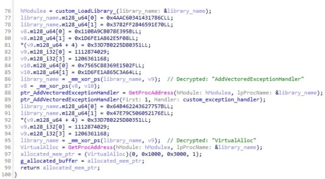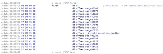 维护两个表的原因是AuraStealer不直接调用这些函数。相反,它故意触发异常,但该异常会被自定义异常处理程序拦截。处理程序检查异常产生的地址,并使用该信息来调度适当的函数地址。