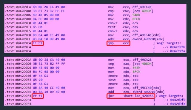 对于间接条件跳转,原则上可以通过分析用于计算目标地址的条件移动并替换 jmp 指令与相应的条件跳转指令。然而,我们选择了一种更简单、更务实的策略。事实上,许多间接跳转只是混淆的循环或 if-then/if-then-else 使用指向紧随其后的指令的目标地址之一进行构造。所以,每当我们遇到间接的 jmp 指令恰好有两个可能的目标,其中之一是失败地址,我们替换 jmp 指令与 jnz (如果不为零则跳转)指向非失败目标地址。