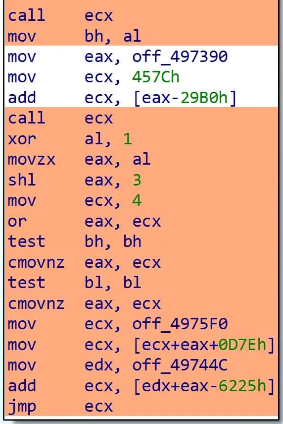 图 5:用于计算间接条件跳转的目标地址的更复杂的混淆变体的示例。