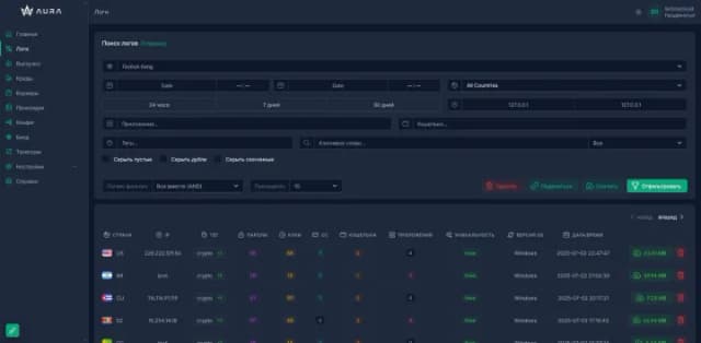 图 3:AuraStealer 的网络面板及其日志管理界面,包括过滤选项和被盗记录的详细列表。