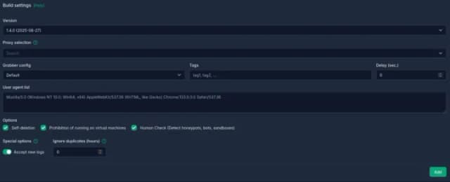 图 32:AuraStealer 的构建设置选项(面板)。