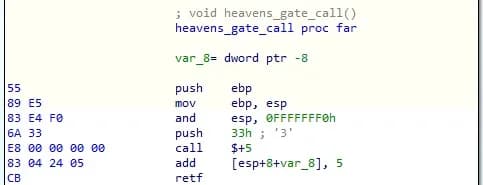 注入本身是通过创建共享部分来实现的 NtCreateSection 并将其映射到目标浏览器进程中使用 NtMapViewOfSection,之后使用注入的有效负载执行 NtCreateThreadEx。注入中涉及的所有 NTDLL 调用都是通过 Heaven’s Gate 执行的,该技术允许从 64 位操作系统上的 32 位进程执行 64 位代码。这既确保了与 64 位浏览器的兼容性,也有助于逃避检测。