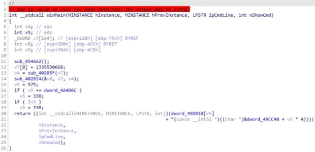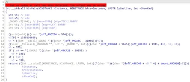 图 7:将偏移量标记为常量之前 WinMain 函数的反编译代码。