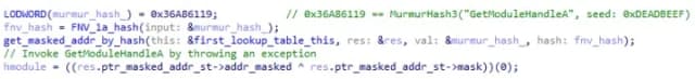 为了解析特定函数,AuraStealer 采用预先计算的 MurmurHash3 值(种子为 0xDEADBEEF) 函数名称,重新散列它 FNV-1a,并使用这两个值来查询第一个预先计算的查找表。该查询返回要抛出异常的 XOR 掩码地址,以及用于保护它的掩码。然后,AuraStealer 揭开该地址的掩码并对其进行调用,故意抛出一个 EXCEPTION_ACCESS_VIOLATION,它被自定义异常处理程序拦截。