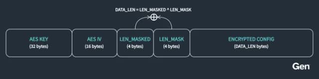 每个 AuraStealer 版本的配置都直接嵌入到二进制文件中,并受到 AES-CBC 加密的保护。加密配置存储为单个连续块,具有线性、序列化布局。加密后的配置结构如下: