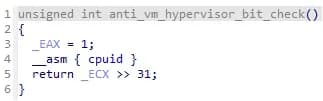 Anti-VM 检查由多个子检查组成。首先,使用以下命令检查虚拟机管理程序是否存在 cpuid 操作说明。什么时候 cpuid 执行的是 EAX = 1,第 31 位 ECX 表示环境——它是 0 在物理机器上并且 1 在虚拟机上。
