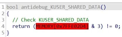 反调试检查包括几个子检查,首先检查文件中众所周知的调试标志 PEB, 包括 BeingDebugged 和 NtGlobalFlag,以及 KUSER_SHARED_DATA 结构。有关如何使用这些标志来检测调试器的详细说明,请参见 这里.