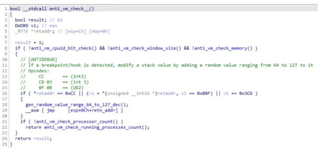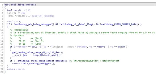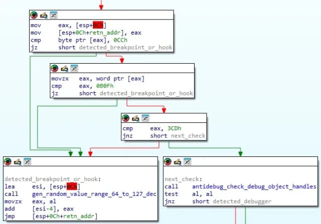 值得注意的是,细心的读者可能会注意到,在反编译的反调试和反虚拟机检查功能中,AuraStealer 采用了一种额外的反调试技术,该技术在其代码库中的各种功能中使用。该技术的工作原理是检查位于函数返回地址的操作码。如果断点指令(INT3 或者 INT 3)或一个 UD2检测到指令(通常用于挂钩),生成 64 到 127 之间的随机值并将其添加到偏移量处的堆栈变量中 −4 从返回地址。 The intent behind this technique is not to crash the program immediately, but to plant a subtle corruption that only results in a crash later during execution, making it very hard to determine the crash origin.