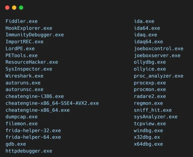如果之前的所有检查都通过,AuraStealer 将使用以下命令创建一个新的调试对象 NtCreateDebugObject 并随后调用 NtQueryObject。由于该对象刚刚创建,因此它应该只存在一个句柄——由程序本身持有的句柄。但是,如果附加了调试器或其他监视工具(通常会挂钩这些函数或重复句柄以进行分析),则 HandleCount 可能大于一。在这种情况下,AuraStealer 会继续将所有正在运行的进程的名称与硬编码的黑名单进行比较,如果发现任何匹配,则会终止其执行。