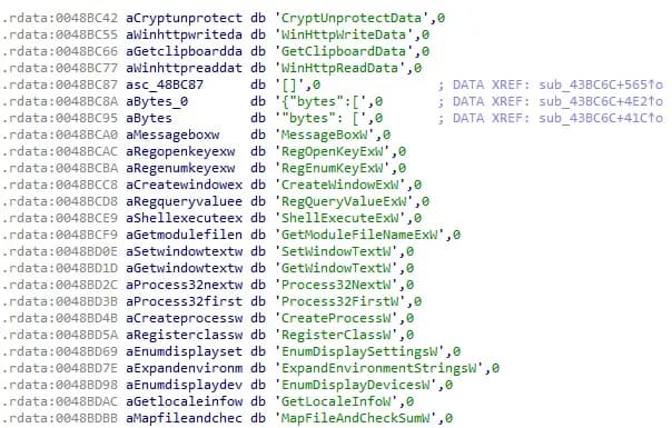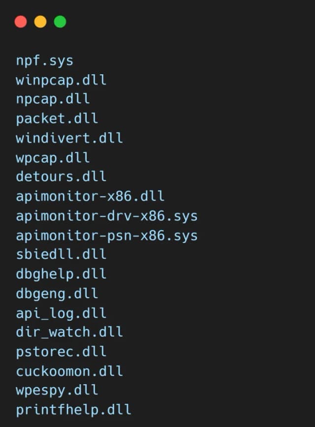 最后,AuraStealer 检查当前加载的模块列表,并将它们与以下列入黑名单的 DLL 列表进行比较: