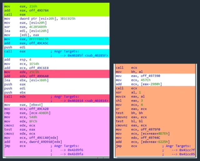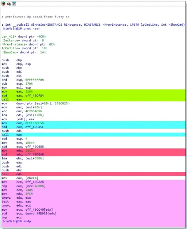 图 4:WinMain 函数的反汇编代码,通过间接控制流混淆进行混淆。不同的颜色用于标记影响特定间接跳转/调用的指令。