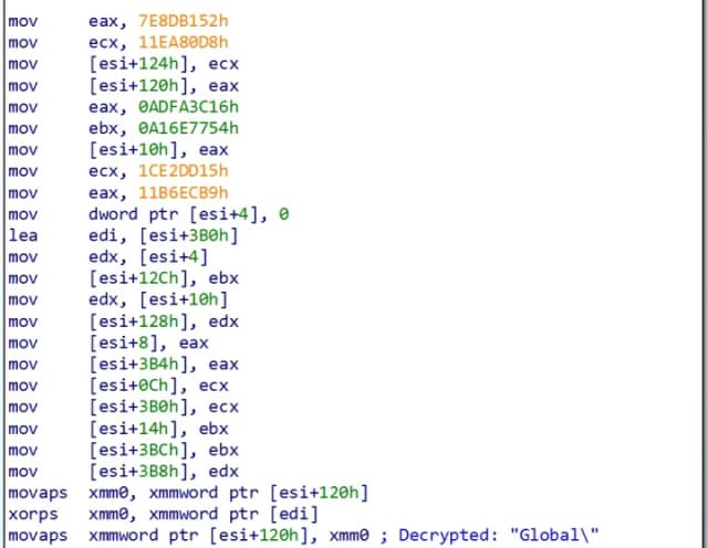 注入的有效负载是与位置无关的 shellcode,在运行时针对每个目标浏览器进程稍作修改。在 shellcode 内的预定义偏移处,AuraStealer 使用以下形式的路径填充两个随机生成的文件名C:\Users\<user>\AppData\Local\Temp\<random_alphanumeric_string_len_16_to_32>,