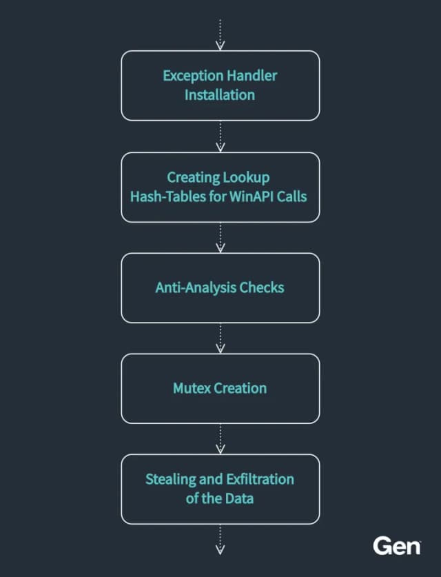 The high-level execution flow of AuraStealer can be summarized as follows.首先,恶意软件安装自定义异常处理程序并创建两个用于异常驱动 API 哈希的查找哈希表。接下来,它执行上述多重反分析检查并解密其嵌入配置。如果所有检查都通过,则继续创建互斥锁。