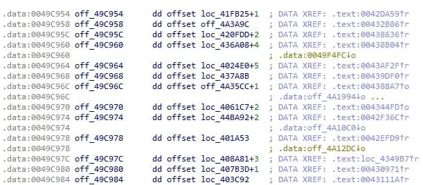 由于这些偏移引用通常出现在连续的块中(图 9),因此自动化它们的处理是很实用的,图 10 中所示的 IDA Python 片段对此特别有用。